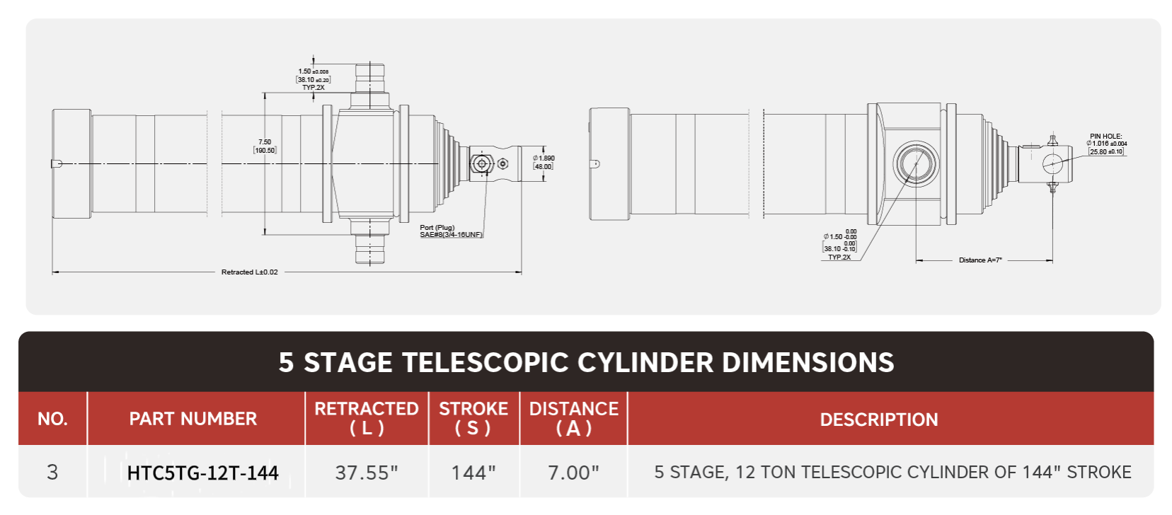 "HTC5TG-12T-144", 5stupňový, 12t 144" zdvihový teleskopický válec