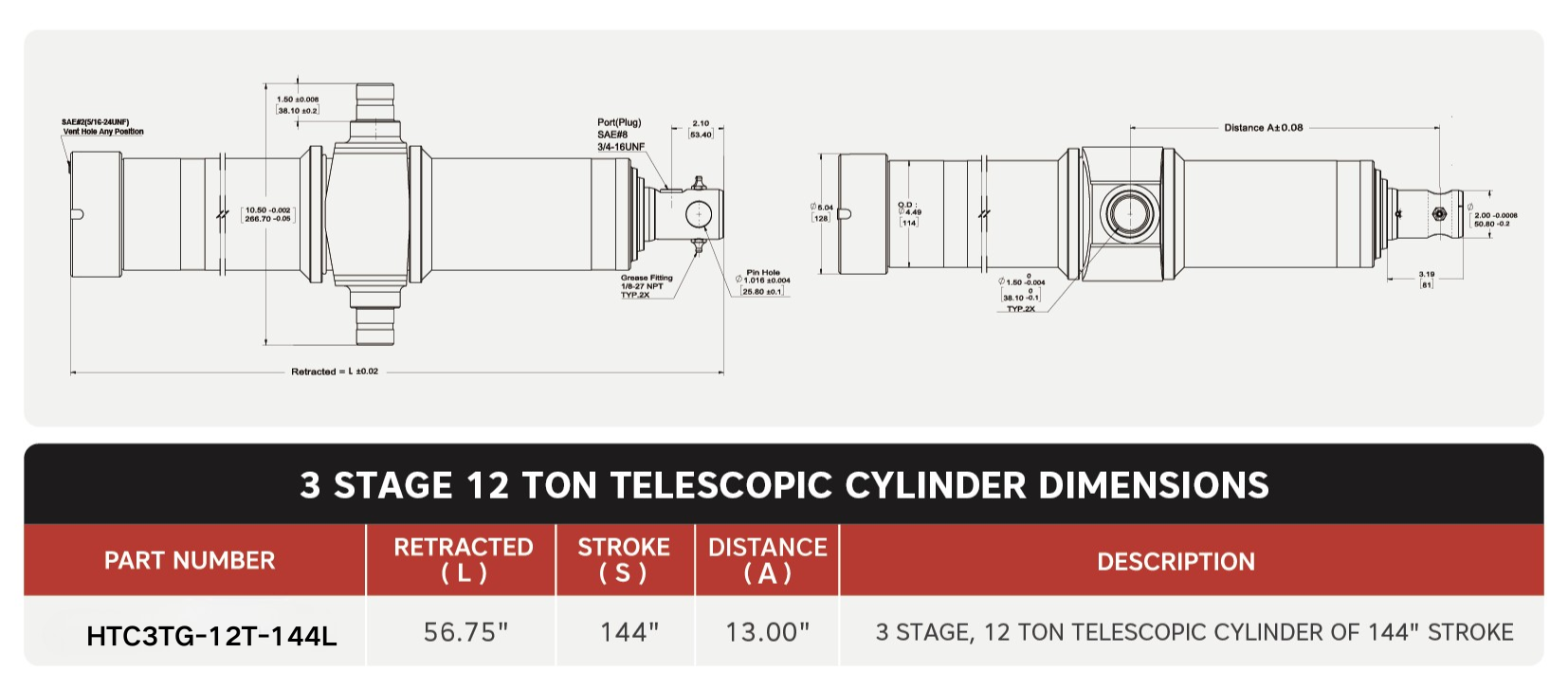 "HTC3TG-12T-144L", 3stupňové, 12 tun 144" zdvihových 13" čepových distančních teleskopických válců