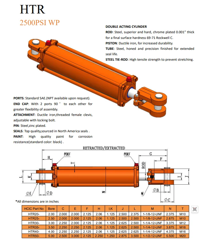 Tento standardní svařovaný válec HCIC s vidlicí má 4" vrtání, zdvih 36" a tyč o průměru 2". Dvojčinné Pracovní porty SAE 8 (-08) ORB(F). Maximální pracovní tlak 2 500 PSI Clevis mounty Včetně 1" montážních kolíků Lesklá černá barva je odolná a odolává vyblednutí